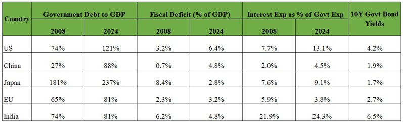 Below we present some data on government debt to GDP for US, Europe, Japan, China and India for 2 years – 2008 and 2024. We have chosen 2008, the year of the Global Financial Crisis as the comparison year because back in 2008 too, the high indebtedness of the world was one of the major contributors to the crisis and the subsequent slow years of growth. We have added the fiscal deficit (also called budget deficit) for 2008 and 2024 and also the interest expense of the government as a proportion of its total expenses.